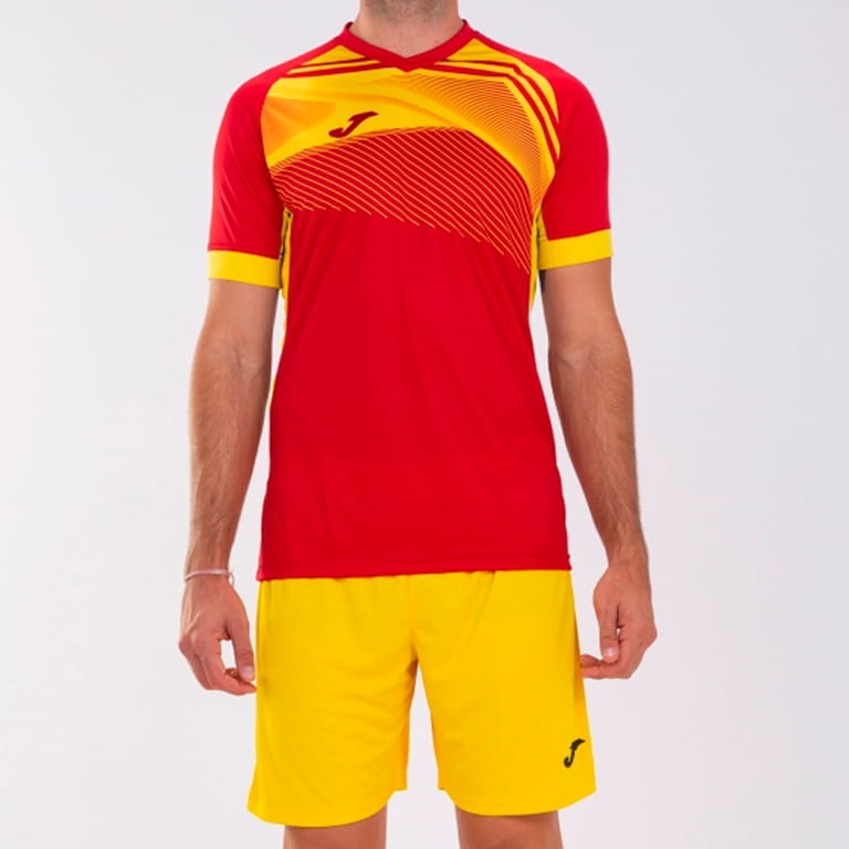 Koszulka z dekoltem w szpic i sublimacją z przodu. Ma raglanowe rękawy i siateczkę po bokach dla lepszej oddychalności. Haftowane logo J.