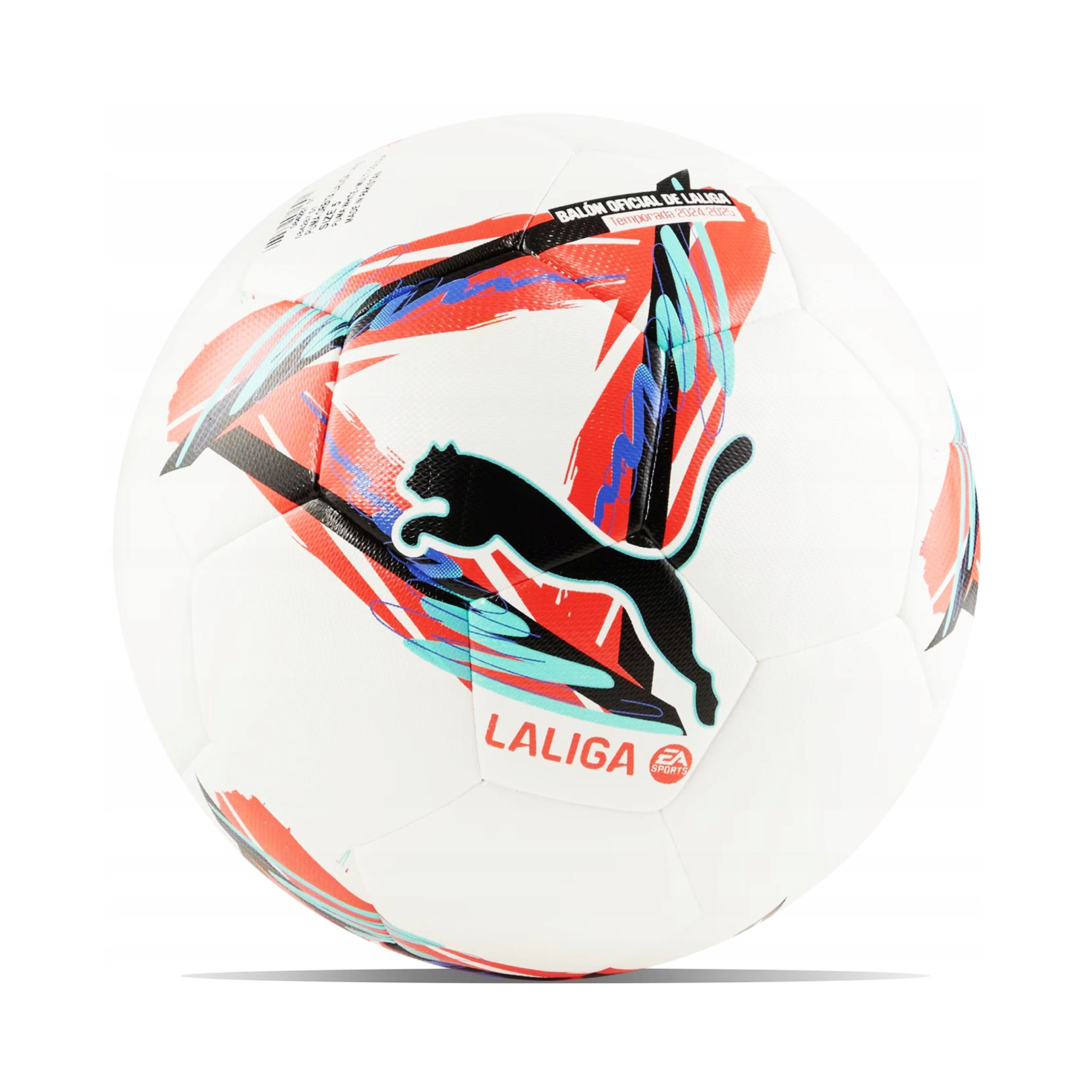 Doskonal swoje umiejętności, trenując piłką nożną Puma Orbita La Liga 1 Hybrid 2024 - 2025 i czerp z niepowtarzalnego stylu gry hiszpańskich klubów. Model inspirowany oficjalną piłką meczową zyskał wyjątkowy design, w którym ekspresyjne detale są uzupełnieniem stonowanej bieli. Logo Puma na froncie podkreśla oryginalny charakter piłki i jej wyjątkowy styl. Hybrydowa konstrukcja charakteryzująca się brakiem widocznych szwów zyskała 32 syntetyczne panele o jednakowej wielkości, co zapewnia trwałość piłki i zapobiega wchłanianiu wody, utrzymując stałą wagę futbolówki w każdych warunkach. Solidna powłoka PU i piankowe podszycie w połączeniu z gumową dętką oferują optymalną miękkość, która przekłada się na kontrolowany lot i przewidywalność po dobiciu.